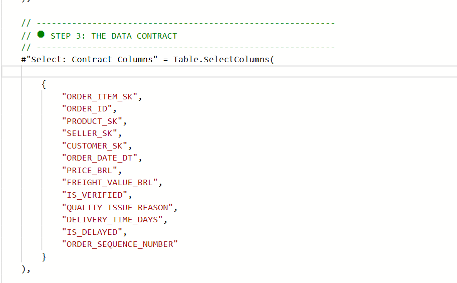 | Schema Contract | Table.SelectColumns() explicit list |